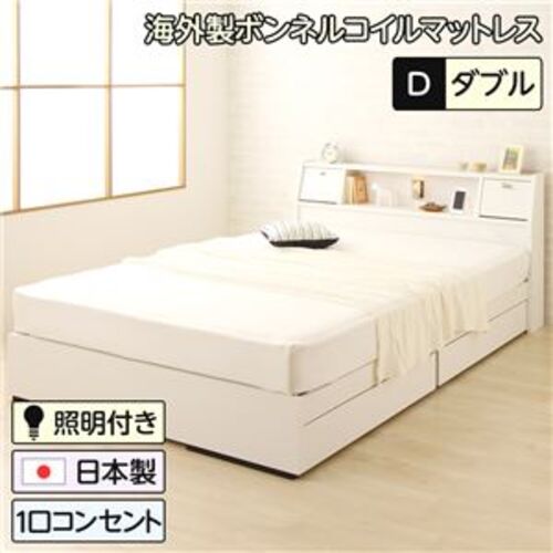日本製 照明付き フラップ扉 引出し収納付きベッド ダブル 【ボンネルコイル(外周のみポケットコイル)マットレス付き】『AMI』アミ ホワイト 宮付き 白 ■かわいく飾れて、しっかり隠せるヘッドボードオープンスペースにはお気に入りの雑貨などを飾って、隠…