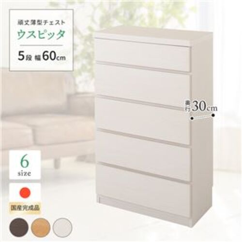 頑丈薄型チェスト/収納棚 【5段 幅60cm ホワイト木目調】 奥行30cm 日本製 『ウスピッタ』 【完成品】 ■奥行30cmなので、狭い場所でも置けるリビング、脱衣所、寝室、トイレなど、薄型省スペースだから設置可能どこに置いても圧迫感なくご利用いただけます。…